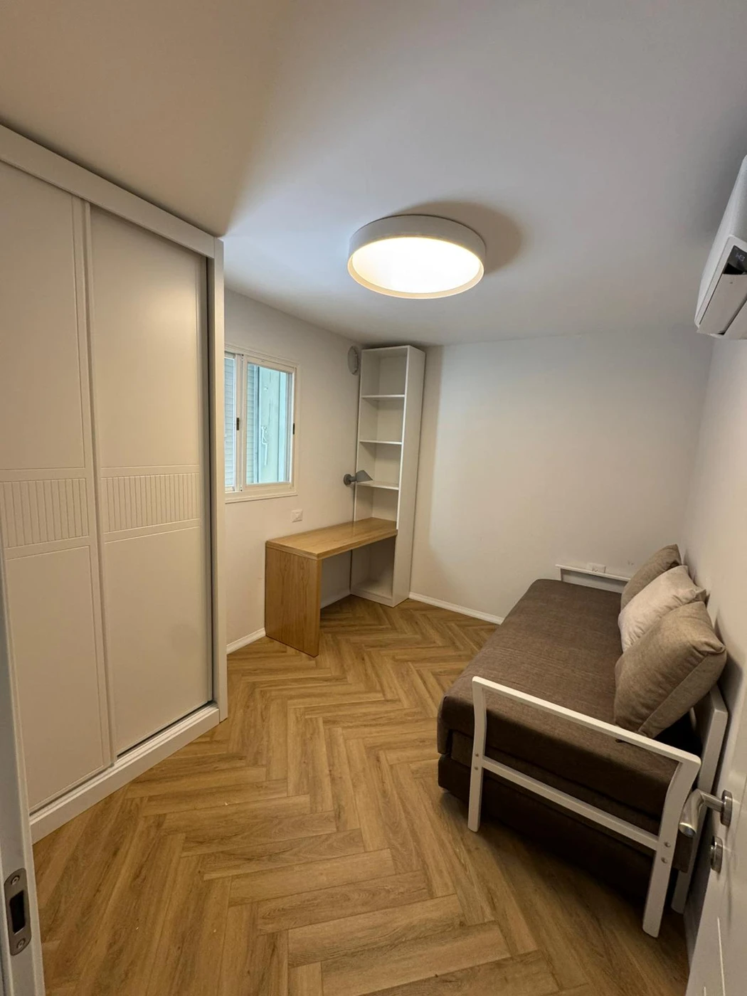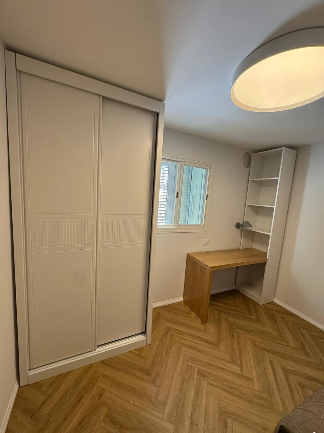 הארון הוזמן בעיצוב אישי, עם חזית חלקה וקווים חרוטים עדינים. ידיות המיטה נבחרו כך שיתאימו לארון באופן ישיר. שולחן העבודה ממשיך את הקו החם של ריצפת העץ ומשלים את ההרמוניה החומרית והצבעונית בחלל. כריות הנוי והריפוד נבחרו בהזמנה אישית מבד יוקרתי, כחלק מתכנון כולל של מראה החד